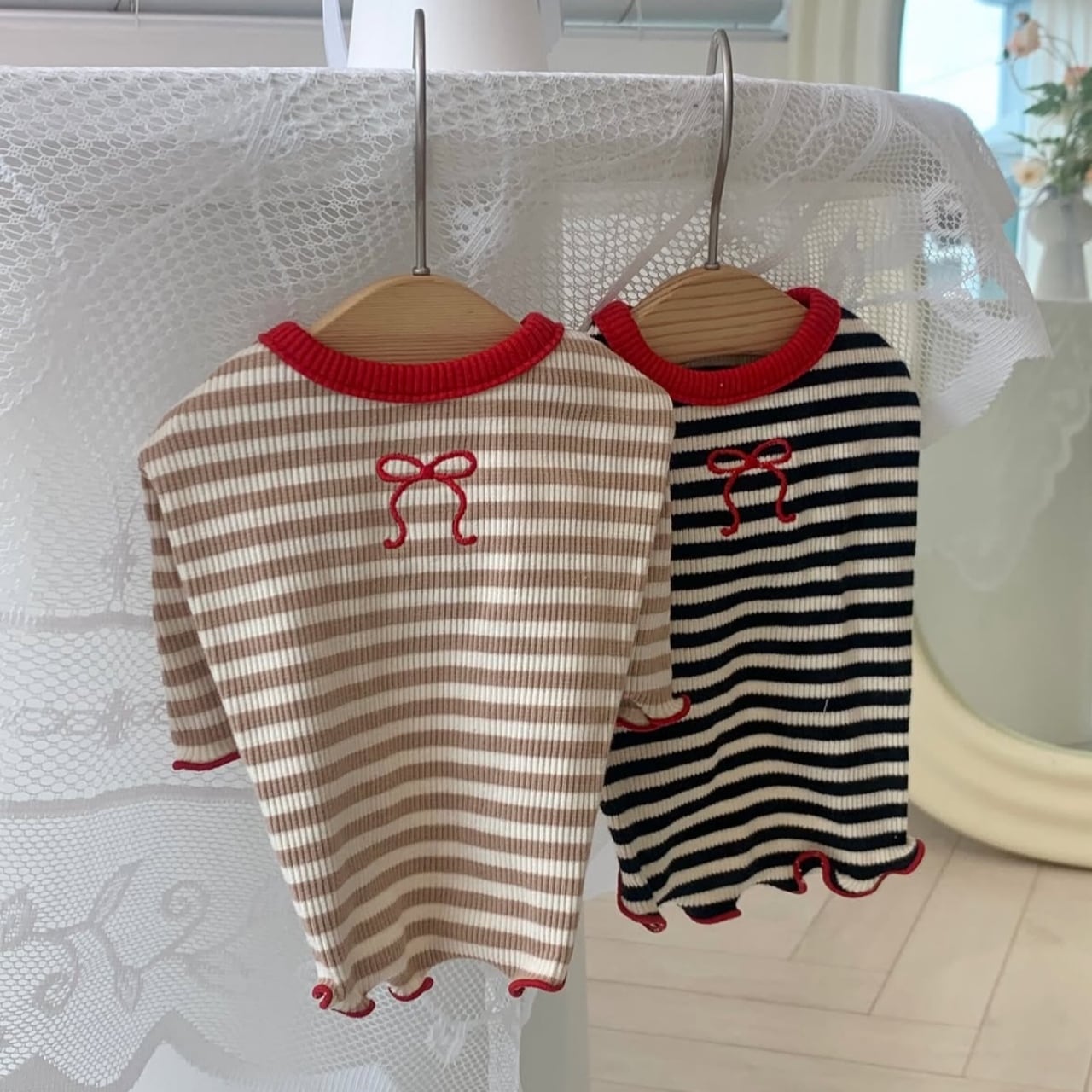 stripe柄に赤のリボン刺繍がpointの